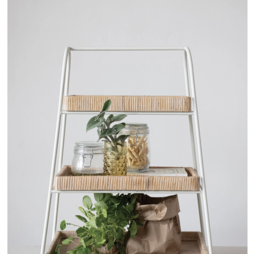 19-1/2\"L x 11\"W x 26\"H Decorative Metal, Wood & Bamboo 3-Tier Tray w/ Removable Trays, White & Natural
