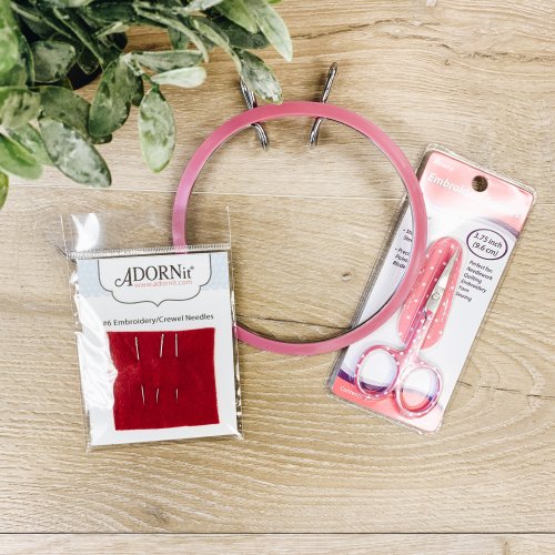 7 inch hoop, embroidery scissors and needles.
