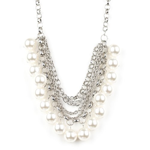 A collision of mismatched silver chains layer below the collar. Oversized white pearls dangle from the lowermost chain, creating a dramatically refined fringe for a statement-making finish. Features an adjustable clasp closure. Sold as one individual necklace. Includes one pair of matching earrings.
