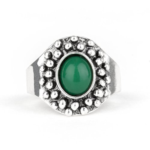An oval Eden bead is pressed into a dainty silver frame radiating with antiqued silver studs for a whimsical look. Features a dainty stretchy band for a flexible fit.