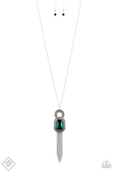 An oversized emerald green gem is pressed into the center of an antiqued silver pendant radiating with ornate detail. Rounded silver snake chains stream from the bottom of the heirloom inspired pendant for a vintage finish. Features an adjustable clasp closure.