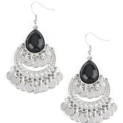 A black teardrop bead gives way to a shimmery silver crescent frame for a playful look. Shiny silver discs swing from the bottoms of both frames, creating a flirtatious double fringe. Earring attaches to a standard fishhook fitting.