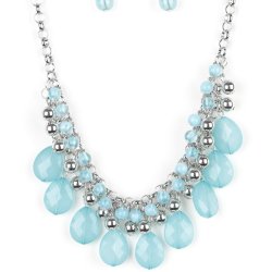 A row of cloudy blue beads gives way to a row of shiny silver beads. Brushed in an opalescent finish, blue teardrops cascade from the bottom of bold interlocking silver chains, creating a dramatically colorful fringe. Features an adjustable clasp closure.