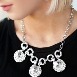 Three dramatically oversized rhinestones are nestled into three textured fittings that are connected by oval rings, creating a brilliant statement piece. Features an adjustable clasp closure.