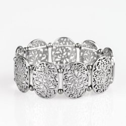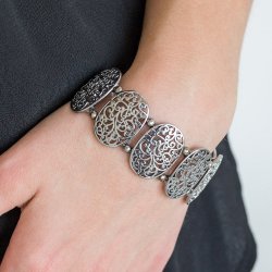 Brushed in a high-sheen finish, vine-like filigree climbs glistening gunmetal frames. Infused with dainty gunmetal beads, the elegant frames are threaded along stretchy bands, creating a refined look around the wrist.