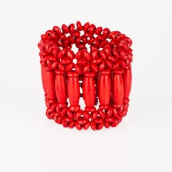 A collection of red wooden beads are threaded along stretchy bands, coalescing into a vivacious beaded palette for a summery look.