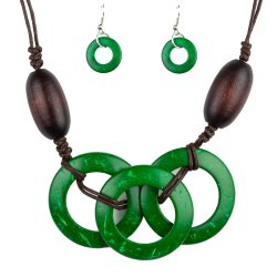 Infused with dramatic brown wooden beads, vivacious green wooden hoops are knotted in place below the collar for a summery flair. Features an adjustable sliding knot closure.