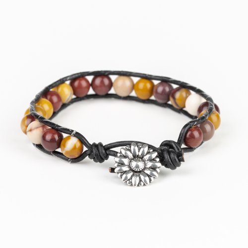 Featuring a silver floral fitting, a collection of refreshing stones are threaded between two strands of black cording around the wrist for a seasonal flair. Features a button loop closure.