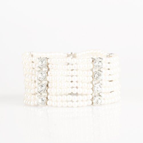 Held together by stacked white rhinestone encrusted frames, a collection of dainty white pearls are threaded along stretchy bands around the wrist for a timeless twist.