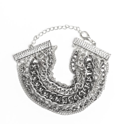 A gritty mix of mismatched silver and gunmetal chains is strung between two hammered silver fittings, creating edgy layers around the wrist. Features an adjustable clasp closure.