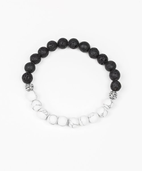 Infused with dainty silver accents, a collection of black lava rock and refreshing white stone beads are threaded along a stretchy band around the wrist for a seasonal style.