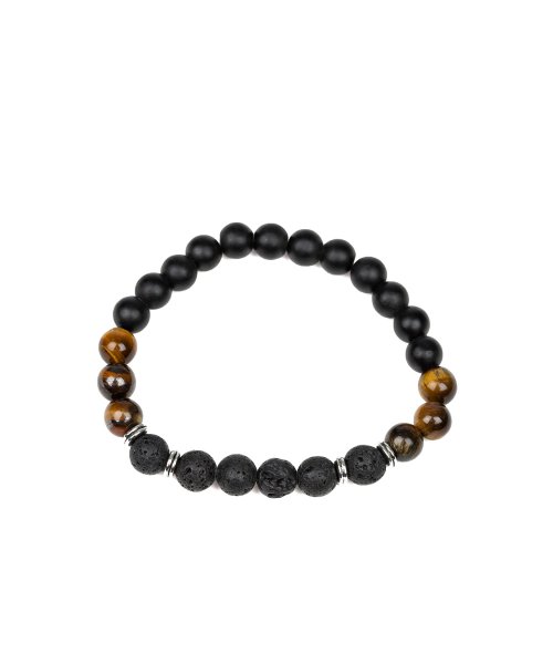 Infused with dainty silver accents, a collection of black lava rock, earthy tiger\'s eye stones, and smooth black stone beads are threaded along a stretchy band around the wrist for a seasonal style.