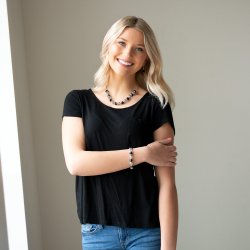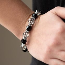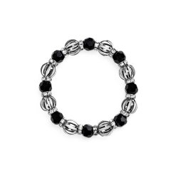 A collection of airy silver beads, glittery black rhinestone beads, and white rhinestone encrusted rings are threaded along for a statement-making fashion. Features an adjustable clasp closure.