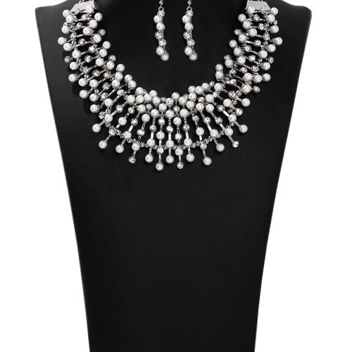 A collection of sleek silver bars fans out along the collar in a regal display. Each bar is dotted in dainty white pearls and sparkling white rhinestones, resulting in a perfect mix of polished refinement and scattered sparkle. Features an adjustable clasp closure.
