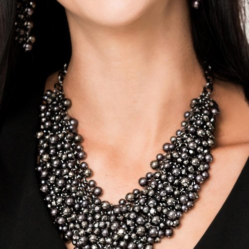 A seemingly infinite collection of gunmetal beads erupts from a bed of interconnected gunmetal links, creating an intoxicating fringe that falls below the collar. Sparkling hematite rhinestones are sprinkled throughout the pearly beads, adding blinding hints of shimmer to this daring design. Features an adjustable clasp closure.