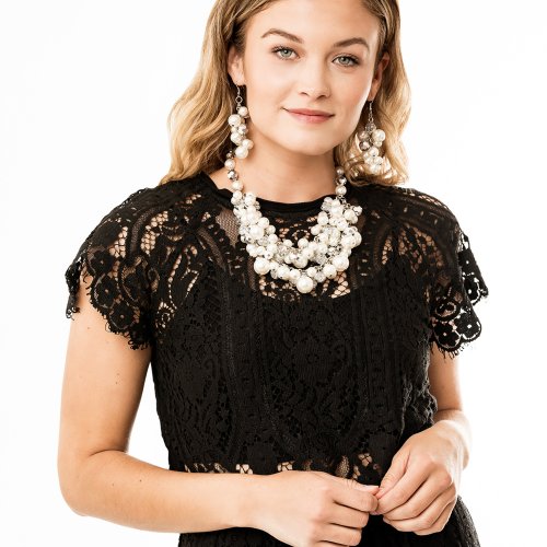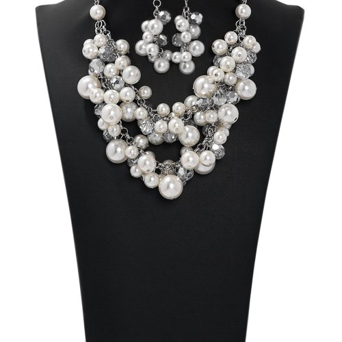 A timeless collection of bubbly white pearls and faceted crystal-like beads dances along the collar in two rows of dramatic clusters. One side of the glassy crystals have been dipped in a flashy metallic finish, adding some refined razzle dazzle to this pearly showstopper. Features an adjustable clasp closure.
